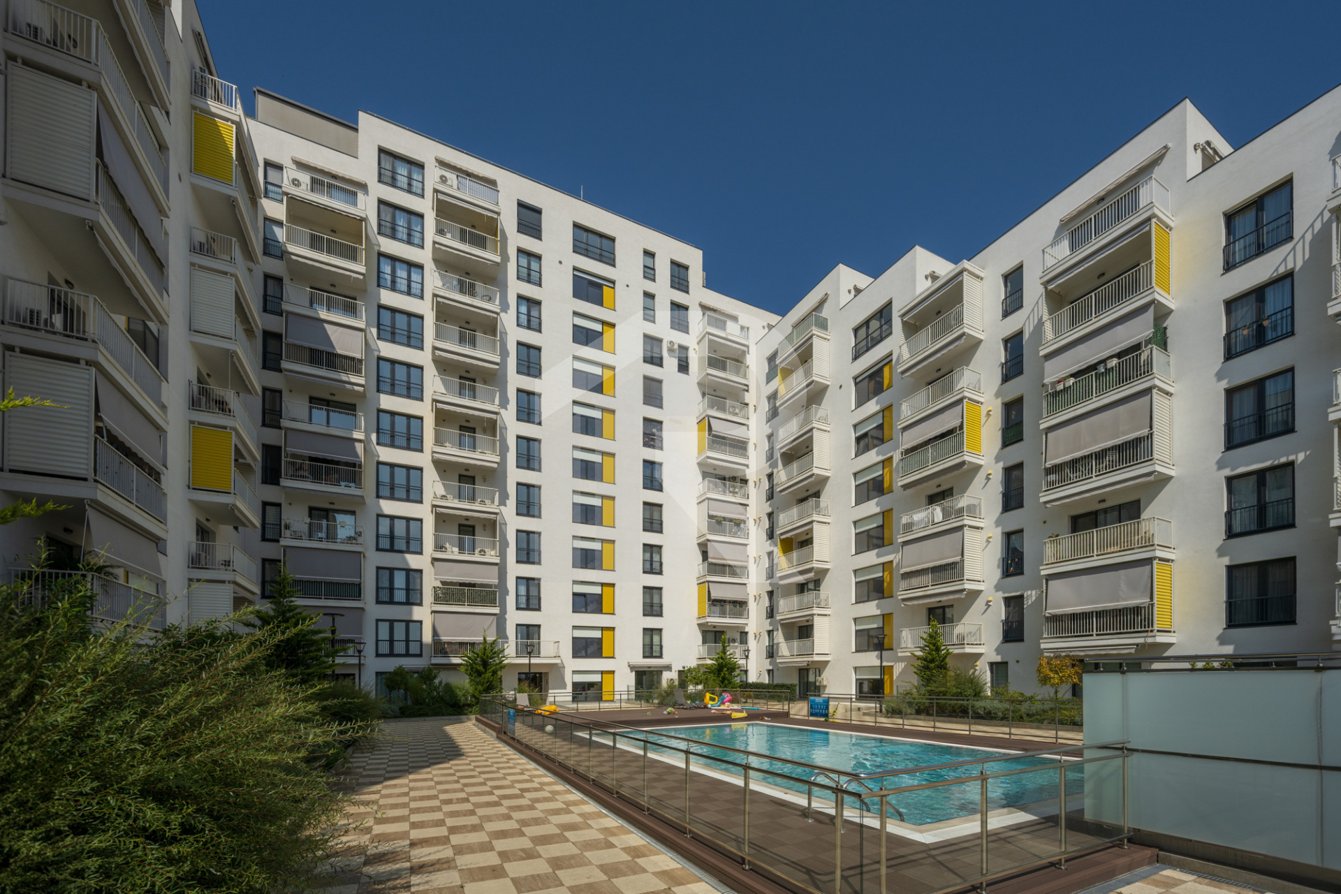 Complex rezidențial premium, cu piscină, zone verzi și facilități de recreere, supraveghere video.